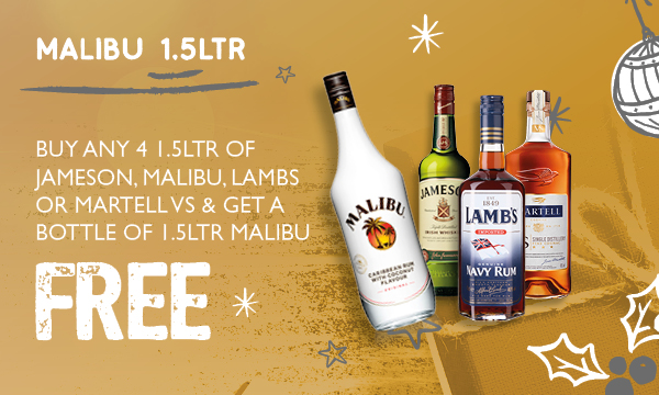 FREE 1.5ltr bottle of Malibu, when you buy any 4 x 1.5ltr of Jameson, Malibu, Lambs or Martell VS. 250 deals available from 25th November 2019.