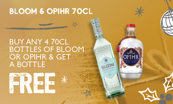 FREE 70cl bottle of Bloom or Opihr, when you buy any 4 x 70cl bottles of Bloom or Opihr. 400 deals available from 25th November 2019.