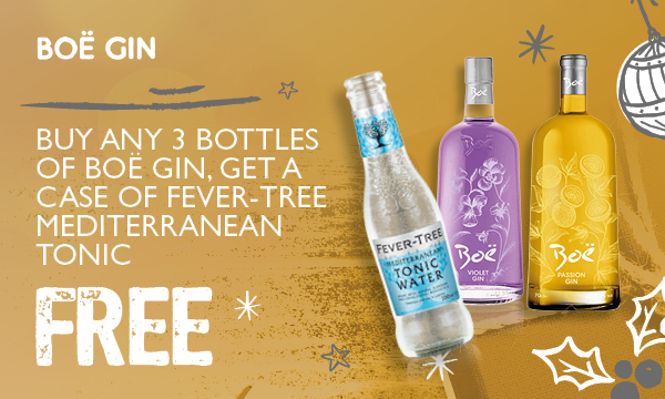FREE case of Fever Tree Mediterranean Tonic, when you buy any 3 x bottles of Boë gin (Violet or Passion). 200 deals available from 25th November 2019.