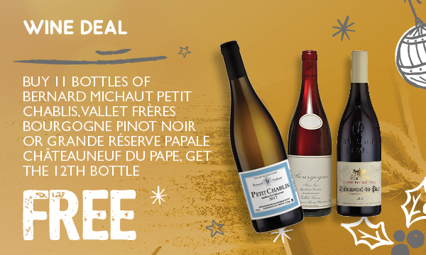 FREE 12th bottle, when you buy 11 x bottles of Bernard Michaut Petit Chablis, Vallet Frères Bourgogne Pinot Noir or Grande Réserve Papale Châteauneuf du Pape. 50 deals available from 25th November 2019.