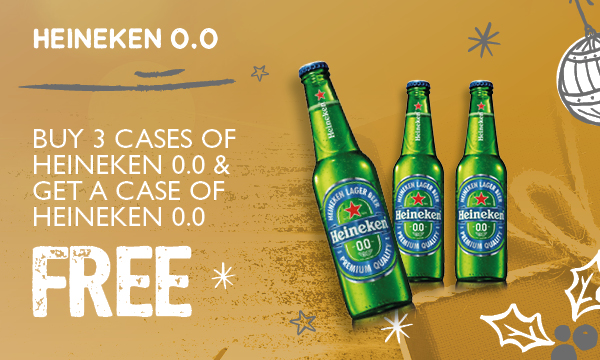 FREE case of Heineken 0.0, when you buy 3 x cases of Heineken 0.0. 200 deals available from 25th November 2019.