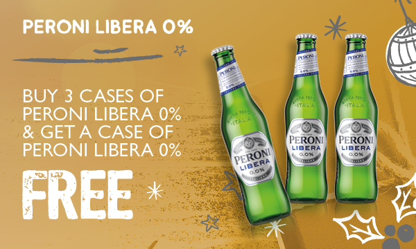 FREE case of Peroni Libera 0%, when you buy 3 x cases of Peroni Libera 0%. 200 deals available from 25th November 2019.