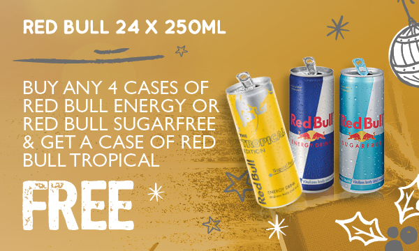 Red Bull Deal Buy any 4 x cases of 24 x 250ml Red Bull Energy or Red Bull Sugarfree, get a 12 x 250ml case of Red Bull Tropical FREE FREE 12x250ml case of Red Bull Tropical, when you buy any 4 x cases of 24 x 250ml Red Bull Energy or Red Bull Sugarfree. 400 deals available from 25th November 2019. |