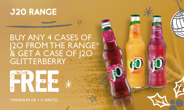 FREE case of J20 Glitterberry, when you buy any 4 x cases of J2o from the range (minimum of 1 x Spritz). 250 deals available from 25th November 2019.