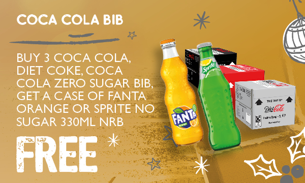 FREE case of Fanta Orange or Sprite No Sugar 330ml NRB, when you buy 3 x Coca Cola, Diet Coke, Coca Cola Zero Sugar BIB. 500 deals available from 25th November 2019.