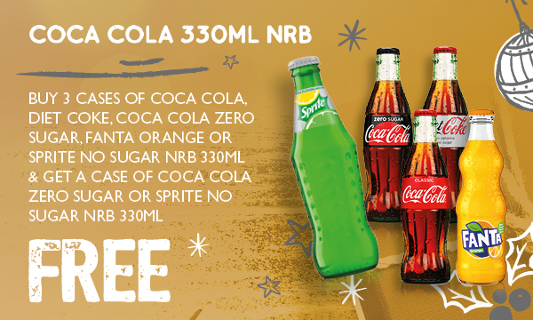 FREE case of Coca Cola Zero Sugar or Sprite No Sugar NRB 330ml FREE, when you buy 3 x cases of Coca Cola, Diet Coke, Coca Cola Zero Sugar, Fanta Orange or Sprite No Sugar NRB 330ml. 500 deals available from 25th November 2019.
