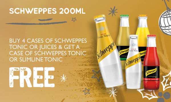 Schweppes 200ml Deal Buy 4 x cases of Schweppes Tonic or Juices 200ml, get 1 x case of Schweppes Tonic or Slimline Tonic 200ml FREE FREE case of Schweppes Tonic or Slimline Tonic 200ml, when you buy 4 x cases of Schweppes Tonic or Juices 200ml. 500 deals available from 25th November 2019. |