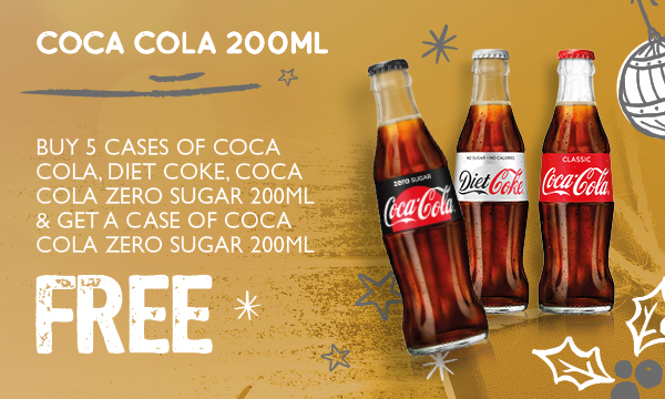FREE case of Coca Cola Zero Sugar 200ml, when you buy 5 x cases of Coca Cola, Diet Coke, Coca Cola Zero Sugar 200ml. 500 deals available from the 25th November 2019.