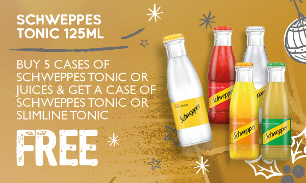 FREE case of Schweppes Tonic or Slimline Tonic 125ml, when you buy 5 x cases of Schweppes Tonic or Juices 125ml. 500 deals available from 25th November 2019.