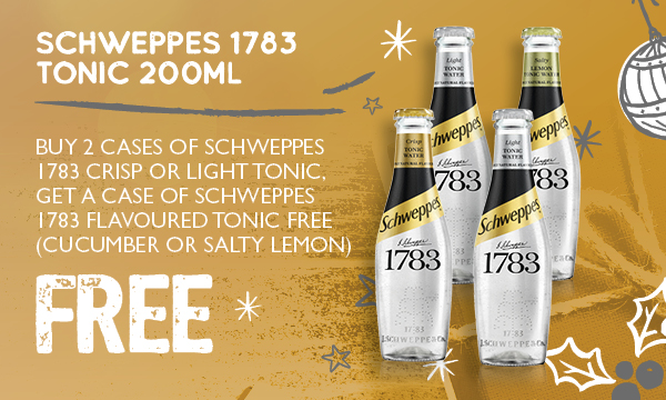 FREE case of Schweppes 1783 flavoured tonic (cucumber or salty lemon), when you buy 2 x cases of Schweppes 1783 Crisp or Light Tonic. 250 deals available from 25th November 2019.