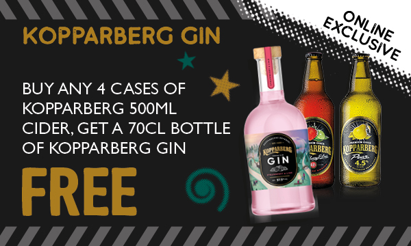 Buy any 4 x cases of Kopparberg 500ml cider, get a 70cl bottle of Kopparberg gin FREE