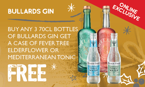 Bullards Gin Deal Buy any 3 x 70cl bottles of Bullards gin, get 1 x case of Fever Tree Elderflower or Mediterranean Tonic FREE FREE case of Fever Tree Elderflower or Mediterranean Tonic, when you buy any 3 x 70cl bottles of Bullards London Dry Gin or Strawberry and Black Pepper Gin. 200 deals available from 29th November 2019. AVAILABLE ONLINE ONLY. |