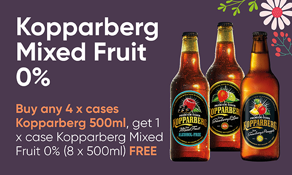 Buy any five cases from across the Kopparberg range and get a case of Kopparberg Mixed Fruits 0% free.