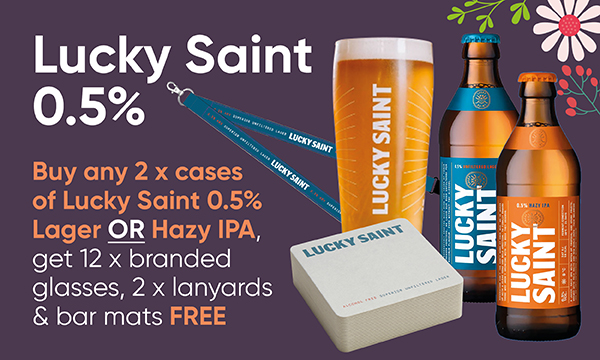 Lucky Saint 0.5% Buy any 2 x cases of Lucky Saint 0.5% Lager or Hazy IPA, get 12 x branded glasses, 2 x lanyards & bar mats FREE