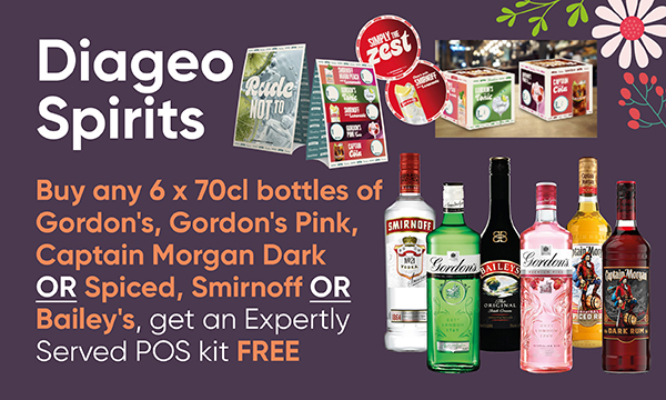 Diageo Spirits Buy any 6 x 70cl bottles of Gordon's, Gordon's Pink, Captain Morgan Dark or Spiced, Smirnoff or Bailey's, get an Expertly Served POS kit FREE