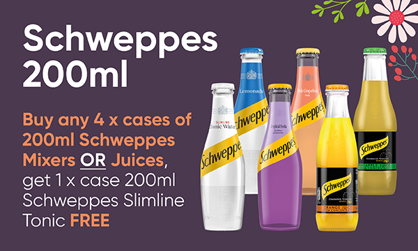 Buy any 4 x cases of 200ml Schweppes Mixers or Juices, get 1 x case 200ml Schweppes Slimline Tonic FREE