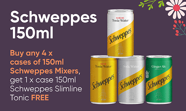 Buy any 4 x cases of 150ml Schweppes Mixers, get 1 x case 150ml Schweppes Slimline Tonic FREE