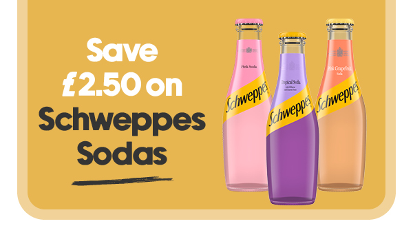 Save £2.50 on Schweppes Sodas Save £2.50 on each case of Schweppes Pink Grapefruit, Tropical & Pink Soda.