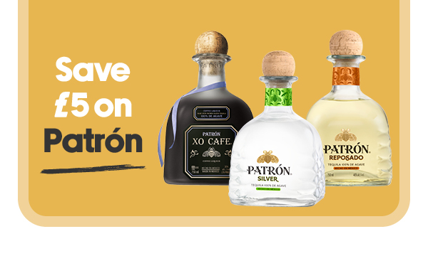 Save £5 on Patron Save £5 on each bottle of Patron Silver, Patron Reposado & Patron XO Café, plus get six drinking vessels free.