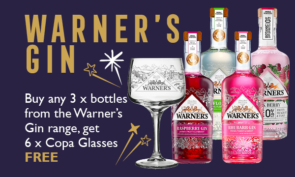 Buy any 3 x bottles from the Warner's Gin range (70cl Elderflower, 70cl Raspberry, 70cl Rhubarb, 50cl Pink Berry 0%), get 6 x Copa Glasses FREE
