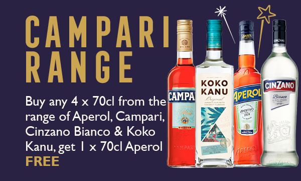Campari Range Buy any 4 x 70cl from the range of Aperol, Campari, Cinzano Bianco & Koko Kanu, get 1 x 70cl Aperol FREE FREE 1 x 70cl Aperol, when you buy any 4 x 70cl from the range (Aperol, Campari, Koko Kanu, Cinzano Bianco 75cl). 150 deals available from 2st Nov 2021. |