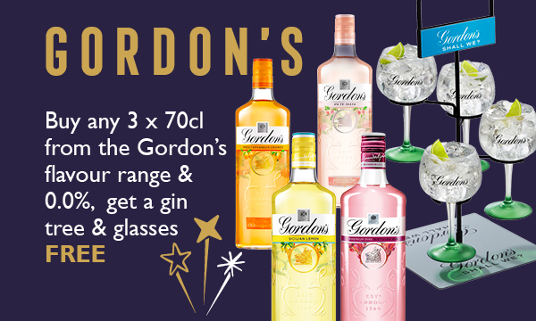 Gordon's Buy any 3 x 70cl from the Gordon's flavour range & 0.0% (Gordon's Pink, Sicilian Lemon, Mediterranean Orange, White Peach, 0.0%), get a gin tree & glasses FREE 6 x Gordon's copa glasses & 1 x Tree FREE Gordon's gin tree and 6 glasses, when you buy any 3 x 70cl from the Gordon's flavour range & 0.0% (Gordon's Pink, Sicilian Lemon, Mediterranean Orange, White Peach, 0.0%). 200 deals available from 1st Nov 2021. Max 2 deals per customer. |