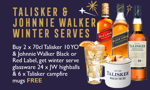 Talisker & Johnnie Walker Winter Serves Buy 2 x 70cl Talisker 10 YO & Johnnie Walker Black or Red Label, get winter serve glassware 24 x JW highballs & 6 x Talisker campfire mugs FREE 24 x JW highballs glasses & 6x Talisker Campfire mugs FREE 24 x Johnnie Walker highball glasses & 6 x Talisker campfire mugs, when you buy any 2 x bottles of Johnnie Walker Black or Red & Talisker 10 YO. 200 deals available from 1st Nov 2021. Max 2 deals per customer. |