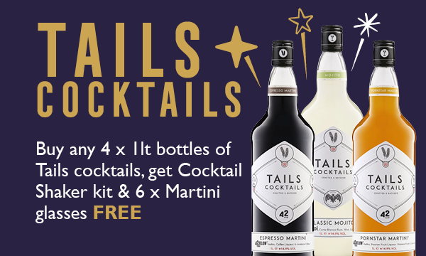 FREE Cocktail Shaker Kit & Martini glasses, when you buy any 4 x 1lt bottle of Tails cocktails. 200 deals available from 1st Nov 2021. Max 2 deals per customer.