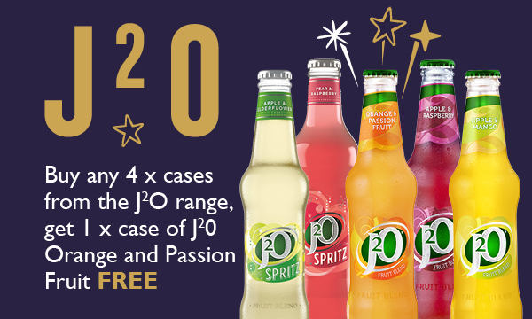 J20 Buy any 4 x cases from the J2O range, get 1 x case of J20 Orange and Passion Fruit FREE FREE 1 x case of J20 Orange and Passion Fruit, when you buy any 4 x cases from the J2O range. 800 available from 1st Nov 2021. Max 3 deals per customer. |