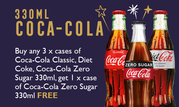 Buy any 3 x cases of Coca-Cola Classic, Diet Coke, Coca-Cola Zero Sugar 330ml, get 1 x case of Coca-Cola Zero Sugar 330ml FREE
