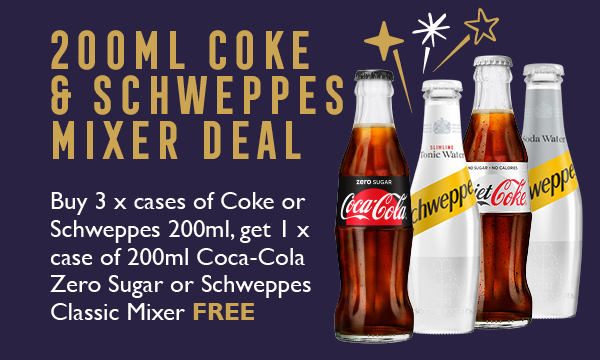 Coke & Schweppes 200ml Mixer deal Buy 3 x cases of Coke or Schweppes 200ml, get 1 x case of 200ml Coca-Cola Zero Sugar or Schweppes Classic Mixer FREE FREE case of Coca Cola Zero Sugar 200ml or Classic Mixer 200ml, when you buy 3 x cases of Coca Cola, Diet Coke, Coca Cola Zero Sugar, Schweppes Tonic, Slimline Tonic, Orange, Tomato, Pineapple 200ml. 1000 deals available from 1st Nov 2021. Max 3 deals per customer. |