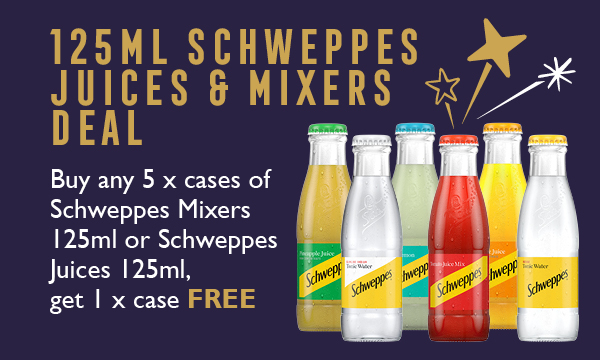 125ml Schweppes Juices & Mixers deal Buy any 5 x cases of Schweppes Mixers 125ml or Schweppes Juices 125ml, get 1 x case FREE FREE case of Schweppes Tonic or Juice 125ml, when you buy any 5 x cases of Schweppes Tonic or Juices 125ml. 1000 deals available from 1st Nov 2021. Max 3 deals per customer. |