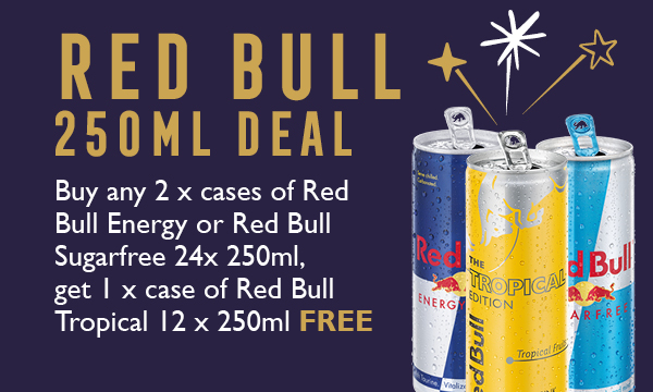 Red Bull 250ml deal Buy any 2 x cases of Red Bull Energy or Red Bull Sugarfree 24x 250ml, get 1 x case of Red Bull Tropical 12 x 250ml FREE FREE 12x250ml case of Red Bull Tropical, when you buy any 2 x cases of 24 x 250ml Red Bull Energy or Red Bull Sugarfree. 1000 deals available from 1st Nov 2021. Max 3 deals per customer. |