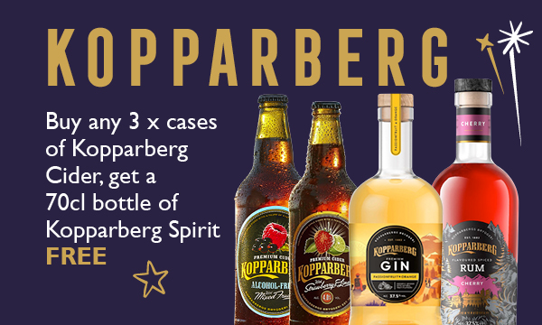 Buy any 3 x cases of Kopparberg Cider, get a 70cl bottle of Kopparberg Spirit (Strawberry/Lime Vodka, Cherry Rum, Strawberry/Lime Gin, Mixed Fruit Gin, Passion Fruit/Orange Gin) FREE