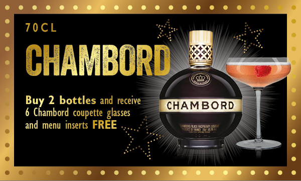 Chambord 70cl Buy 2 bottles and receive 6 Chambord coupette glasses and menu inserts free 6 Chambord coupette glasses, 10 menu cards