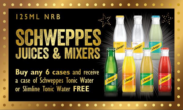Buy any 6 cases and receive a Schsweppes Tonic Weater or Slimine Tonic Water free