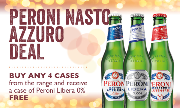 Buy any 4 Peroni Nasto Azzurro 330ml, Peroni Gluten Free 330ml or Peroni Libera 0% cases and receive 1x Peroni Libera 0% FOC
