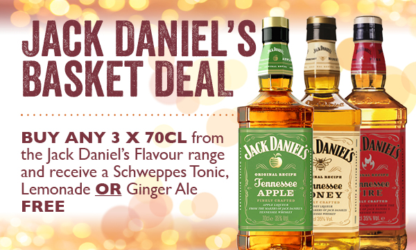 Jack Daniels Flavours Deal Buy any 3 of the Jack Daniel's Flavour range 70cl and get a Schweppes Tonic, Lemonade or Ginger Ale free of charge - Cap at 500 deals
