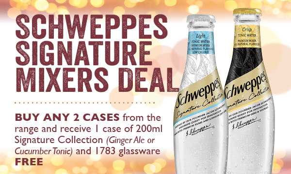 Buy 2 cases of 200ml Schweppes Signature Crisp/Light Tonic (24) get 1 Free Case of 200ml Signature Collection 12's (Ginger Ale or Cucumber Tonic) + receive a box of 12 Schweppes 1783 glasses