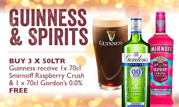 Buy 3x 50L Guinness get 1x 70cl Smirnoff RC & Gordon's 0.0% free