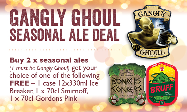 Seasonal Ales, Gangly Ghoul Buy 2x9g from the October seasonal range (one must be Gangly Ghoul) and receive FoC Ice Breaker, vodka or gin Cannot be used with any other promotions. |