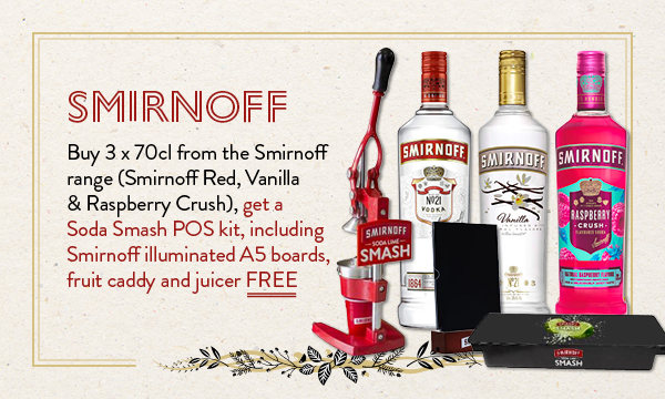 Buy 3 x 70cl from the Smirnoff range (Smirnoff Red, Vanilla & Raspberry Crush), get a Soda Smash POS kit, including Smirnoff illuminated A5 boards, fruit caddy and juicer FREE