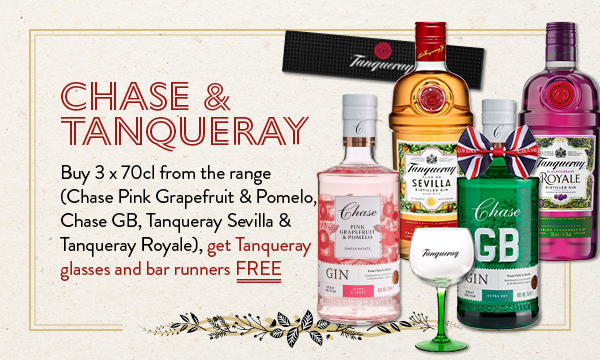 Buy 3 x 70cl from the range (Chase Pink Grapefruit & Pomelo, Chase GB, Tanqueray Sevilla & Tanqueray Royale), get Tanqueray glasses and bar runners FREE