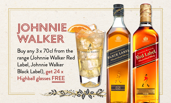 Buy any 3 x 70cl from the range (Johnnie Walker Red Label, Johnnie Walker Black Label), get 24 x Highball glasses FREE