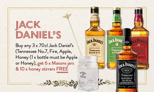 Jack Daniel's Range Buy any 3 x 70cl Jack Daniel's (Tennessee No.7, Fire, Apple, Honey (1 x bottle must be Apple or Honey), get 6 x Masons jars & 10 x honey stirrers FREE Mason jars x 6, honey stirrers x 10 FREE 6 x Masons jars & 10 x honey stirrers, when you buy any 3 x 70cl Jack Daniel's (Tennessee No.7, Fire, Apple, Honey (1 x bottle must be Apple or Honey). 100 deals available from 3rd October 2022. Max 2 deals per customer. |