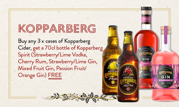 Buy any 3 x cases of Kopparberg Cider, get a 70cl bottle of Kopparberg Spirit (Strawberry/Lime Vodka, Cherry Rum, Strawberry/Lime Gin, Mixed Fruit Gin, Passion Fruit/Orange Gin) FREE