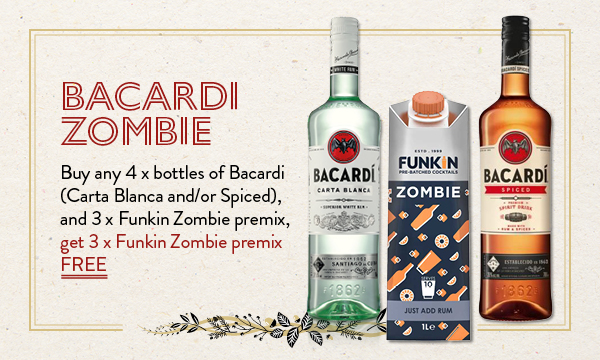 Buy any 4 x bottles of Bacardi (Carta Blanca and/or Spiced), and 3 x Funkin Zombie premix, get 3 x Funkin Zombie premix FREE