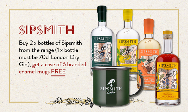 FREE case of 6 branded enamel mugs, when you buy 2 x bottles of Sipsmith (70cl London Dry Gin, 50cl Sipsmith Lemon Drizzle, 70cl London Cup, 50cl Orange & Cacao, 70cl Strawberry Smash) 1 x bottle must be 70cl London Dry Gin. 100 deals available from 3rd October 2022. Max 2 deals per customer.