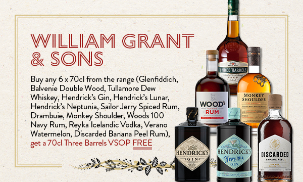 William Grant & Sons Range Buy any 6 x 70cl from the range (Glenfiddich, Balvenie Double Wood, Tullamore Dew Whiskey, Hendrick's Gin, Hendrick's Lunar, Hendrick's Neptunia, Sailor Jerry Spiced Rum, Drambuie, Monkey Shoulder, Woods 100 Navy Rum, Reyka Icelandic Vodka, Verano Watermelon, Discarded Banana Peel Rum), get a 70cl Three Barrels VSOP FREE FREE 70cl Three Barrels VSOP, when you buy any 6 x 70cl from the range (Glenfiddich, Balvenie Double Wood, Tullamore Dew Whiskey, Hendrick's Gin, Hendrick's Lunar, Hendrick's Neptunia, Sailor Jerry Spiced Rum, Drambuie, Monkey Shoulder, Woods 100 Navy Rum, Reyka Icelandic Vodka, Verano Watermelon, Discarded Banana Peel Rum). 500 deals available from 3rd October 2022. Max 3 deals per customer. |