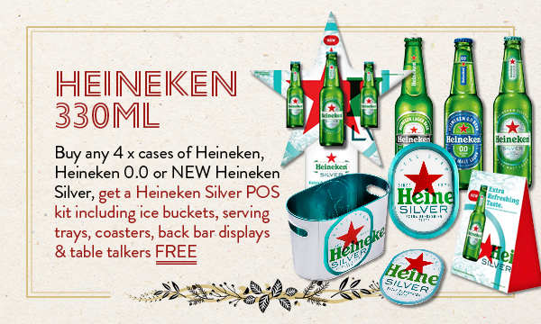 Buy any 4 x cases of Heineken, Heineken 0.0 or NEW Heineken Silver, get a Heineken Silver POS kit including ice buckets, serving trays, coasters, back bar displays & table talkers FREE